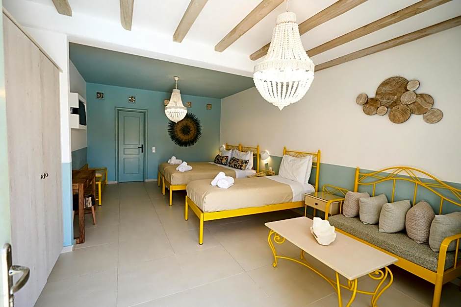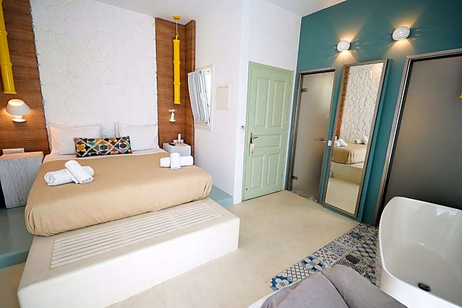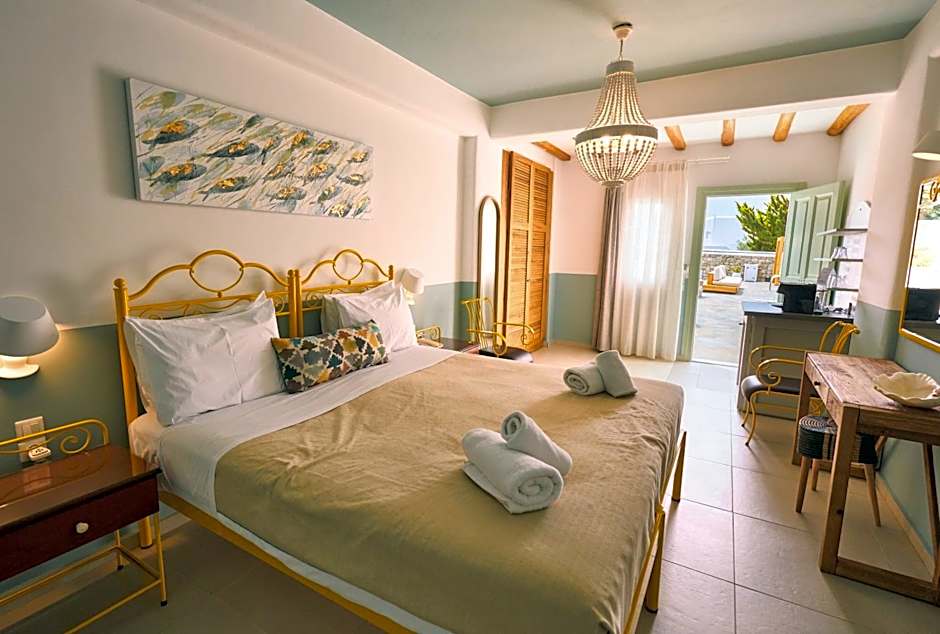These spacious rooms are traditionally decorated. They enjoy a lovely view of the island of Delos and the Aegean Sea from their private balcony.